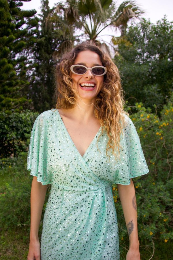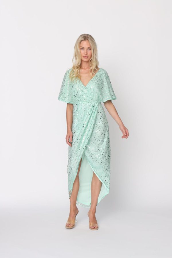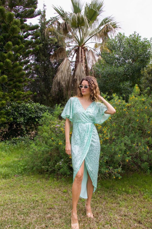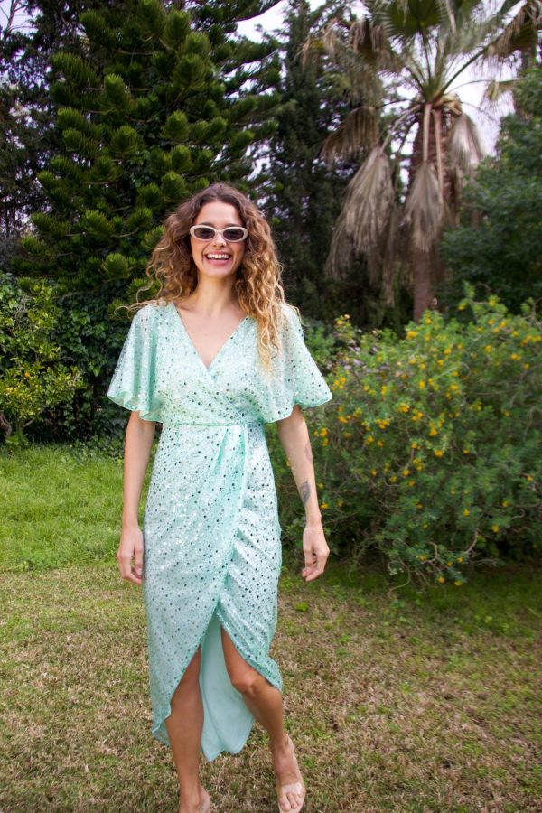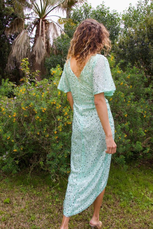 Elegant, long dress adorned with an array of glistening sequins and pearls. The dress has a graceful wrap effect, elegantly showcasing glimpses of leg with every movement. A hidden zipper at the back ensures a seamless fit. Made in 100% recycled polyester.