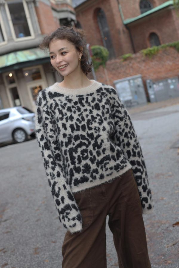A soft sweater in a bold leopard print, offering both comfort and style. The fabric is cozy and soft and with a relaxed fit. The leopard pattern adds a touch of edge, making it a versatile piece that can be dressed up with a lot of accessories or dressed down with jeans. Made from 52% alpaca, 30% nylon, 16% acrylic and 2% elastane. The model is 174 cm tall and wears a size 36.