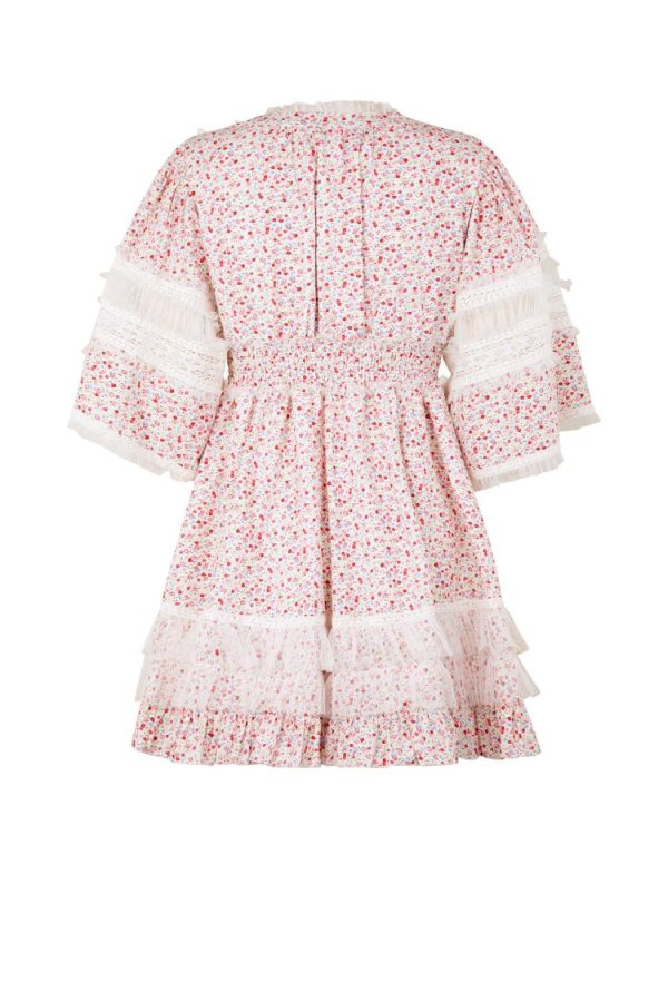 Short, floral dress with v-neck, bell sleeves and lots of lace and frill details – The perfect holiday dress!The model wears size 36 and is 175 cm tall.