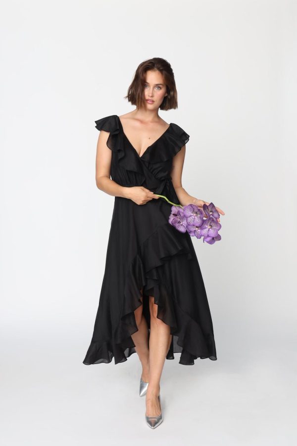 Wrap dress with a midi length. The dress has a regular fit, v-neckline, and delicate ruffle details.The style runs true to size, so we recommend choosing your usual size.• Wrap effect• Ruffle details• V-necklineThe second model is 177 cm tall and wears a size 36.Material: 84% lyocell, 16% polyester.