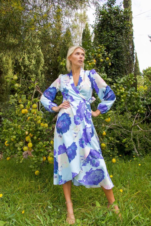 NOTE: Lara dress pale peony and pale peony blue is a pre-order item for delivery later.Expected delivery time: In the picture you will find an estimated time of arrival – this is when we expect to have the item in stock. If other goods are ordered together with the ordered goods, they will be sent separately.Right of return: We charge the full amount when your order is shipped. Your 14-day right of return begins from the moment you receive the physical goods.Elegant long wrap dress with a cool print and ruffle details at the hem. The wrap design creates a flattering silhouette.The dress is true to size, so we recommend choosing your usual size.• Wrap dress• Printed design• Long sleevesThe model is 171 cm tall and wears a size 36.Material: Made from 100% recycled polyester.