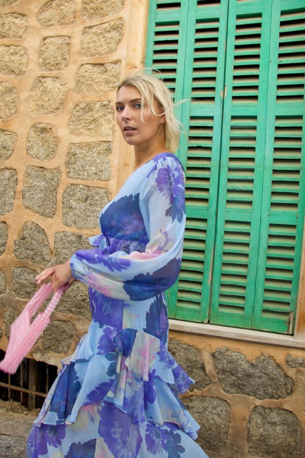 Slim fit maxi dress with floral print. The dress features a cut-out detail at the waist, long sleeves, and a hidden zipper.The style is true to size, so we recommend choosing the size you normally wear.• Floral print• Slim fit• Cut-out detailModel number 2 is 180 cm tall and wears a size 36.Material: 100% recycled polyester.