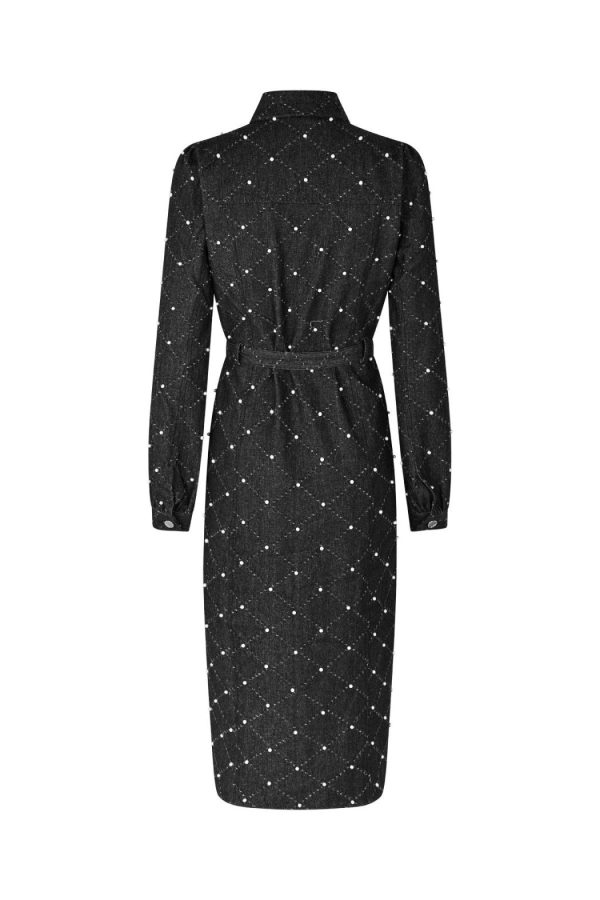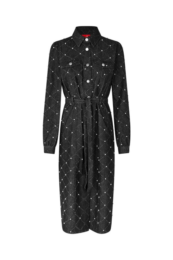 Long-sleeved denim dress with button closure and a waist tie. The dress features an embroidered diamond pattern with delicate pearl details and an elegant midi length.The style is true to size, so we recommend choosing your usual size.• Denim dress• Embroidered diamond pattern with pearls• Midi length• Waist beltThe blonde model is 171 cm tall and wears a size 36. The brunette model is 175 cm tall and wears a size 36.Material: 100% cotton.