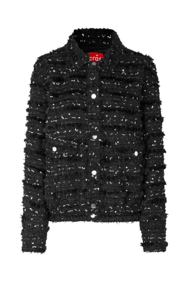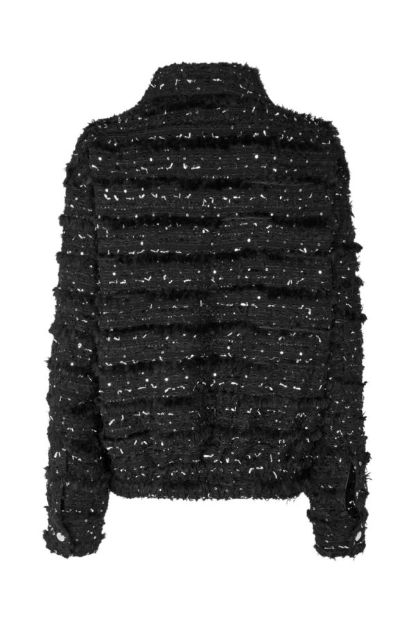 This oversized textured jacket featuring a button-down front and front pockets is made in a fabric with a slightly fuzzy appearance, with horizontal bands. It has shiny silver logo buttons. Made of 50% polyester, 27% viscose and 23% cotton. The model is 175 cm tall and wears a size 36.