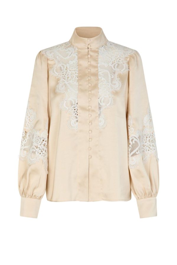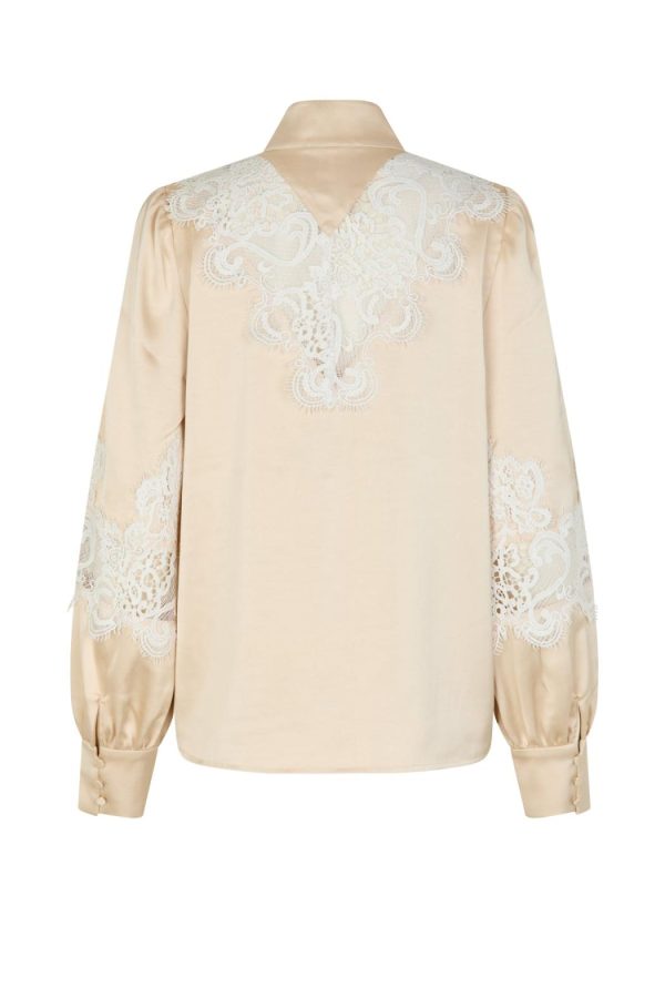 Feminine blouse with lace details at the chest and on the sleeves. The blouse features delicate buttons at the front and a medium-high collar. It is made of a soft satin material. Made from 100% Recycled Polyester.The model is 176 cm tall and wears a size 36.