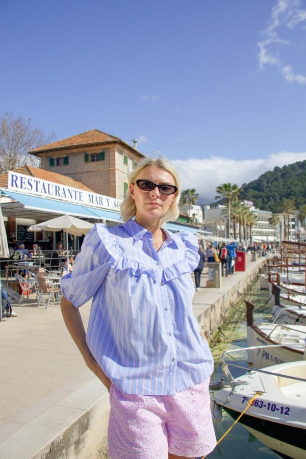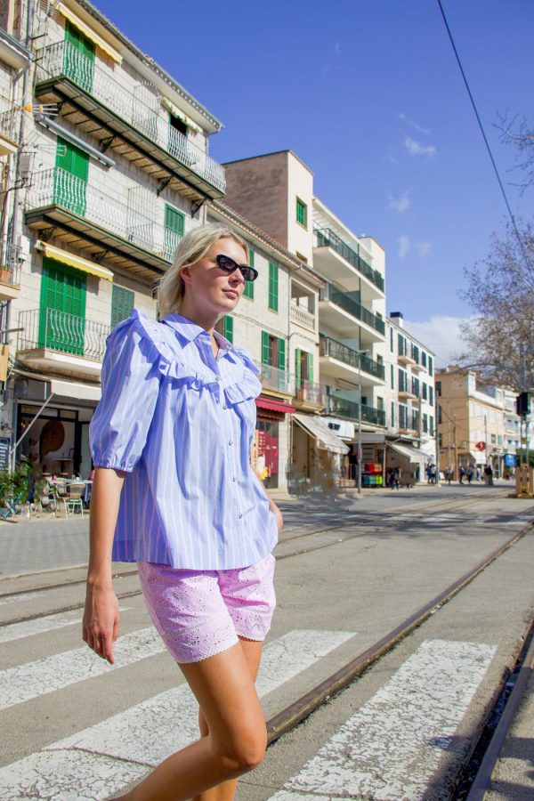 Striped shirt with short sleeves and rhinestone buttons. The shirt has a regular fit, with pleats on the chest and back.The style is true to size, so we recommend choosing the size you normally wear.• Regular fit• Rhinestone buttons• Short sleevesThe blonde model is 180 cm tall and wears a size 36.Material: 100% organic cotton.