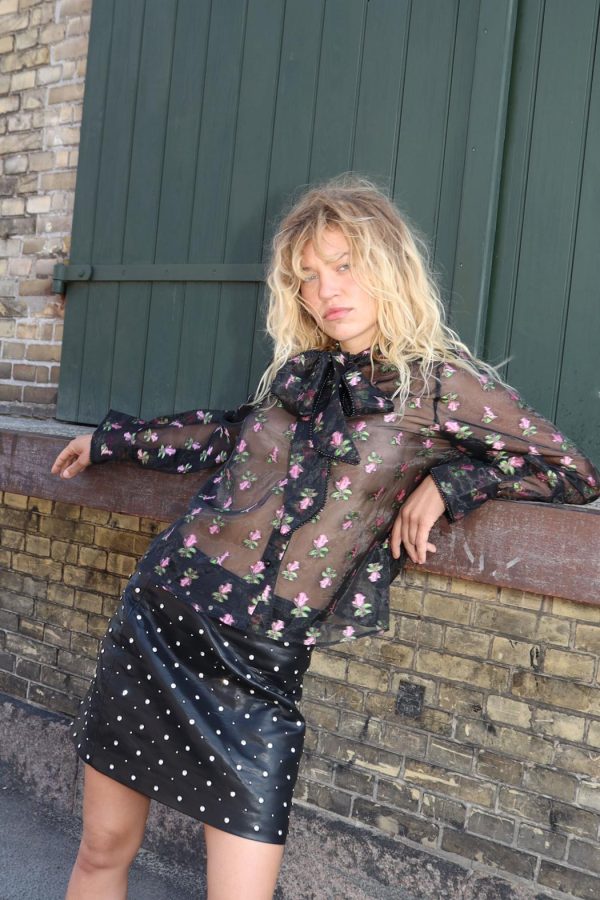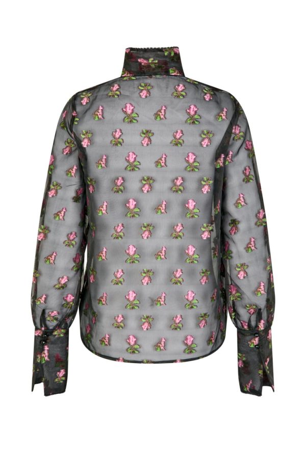 Beautiful blouse crafted from floral embroidered sheer organza fabric. This slightly transparent material is light and airy, perfect for layering. You can style it with a bralette or a top underneath. The blouse features ties around the neckline that can be fastened into a large bow. Made from 85% polyester and 15% nylon.The model is 176 cm tall and wears a size 36.
