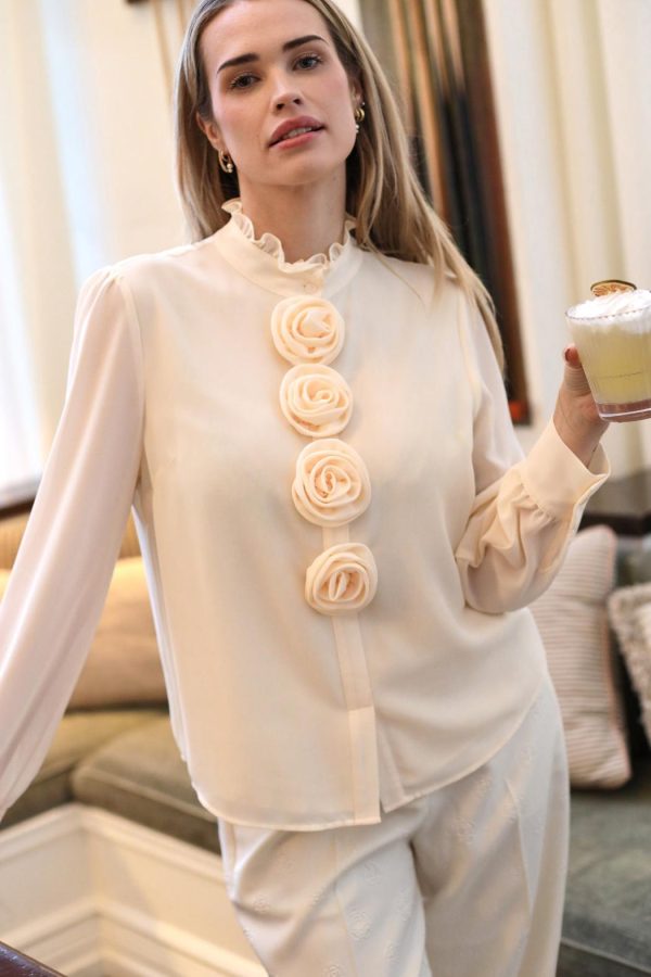 Elegant long-sleeved blouse with delicate floral decorations on the front. The high neckline features subtle ruffles, adding a romantic and vintage-inspired touch.The style runs true to size, so we recommend choosing your usual size.• Long sleeves• Zipper closure• High necklineThe model is 171 cm tall and wears a size 36.Material: 100% recycled polyester.