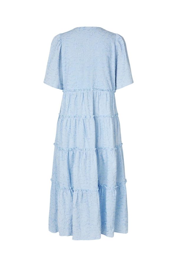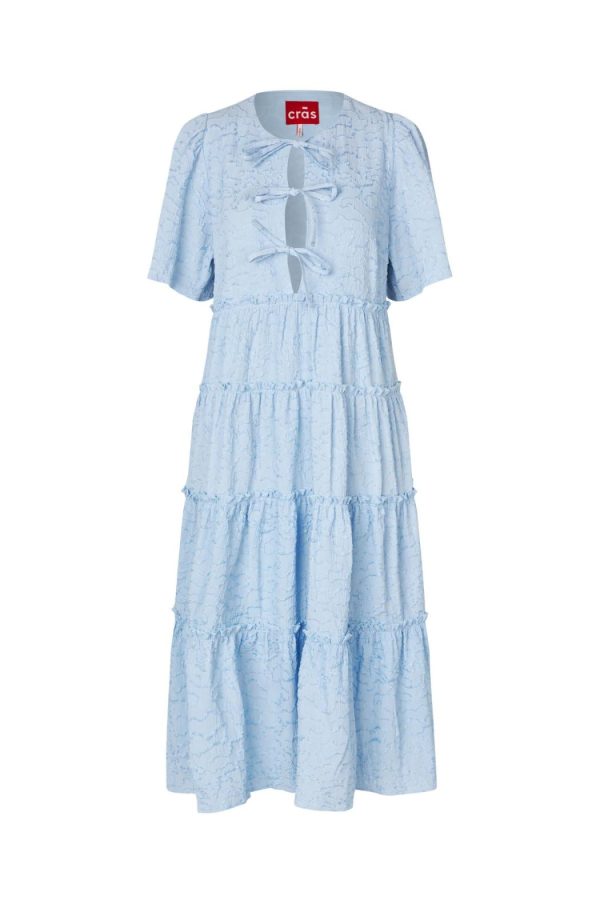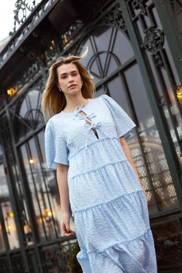 Midi dress with texture and short sleeves. The dress features three bow closures at the chest and has a loose fit.The style runs true to size, so we recommend choosing your usual size.• Loose fit• Midi length• Short sleevesThe model is 171 cm tall and wears a size 36.Materials: 80% polyester, 20% nylon.
