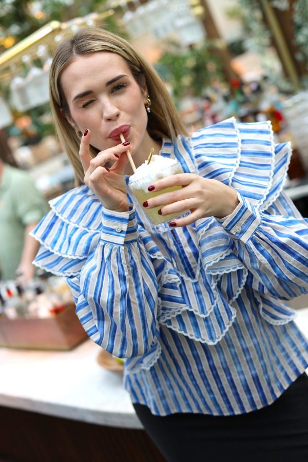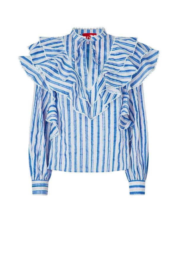 This blouse features a voluminous design, creating movement and texture. The standout detail is the oversized ruffled collar and string closure at neck. The blouse has a regular fit, so we recommend choosing the size you normally wear. • String closure at neck• Long puff sleeves• Frills with volume• Loose fitThe model is 175 cm and wears a size 36.Materials: Made of 39% polyester, 37% cotton, 19% nylon and 9% viscose.
