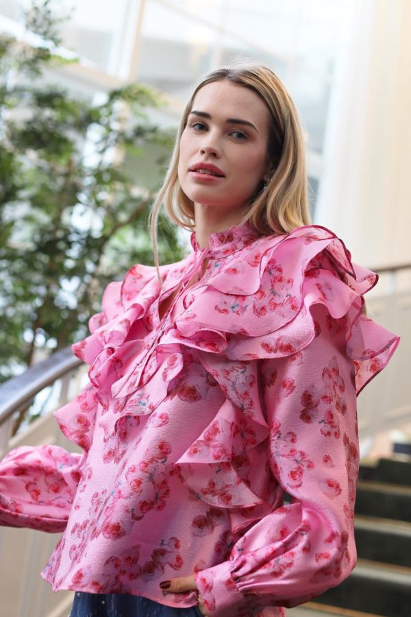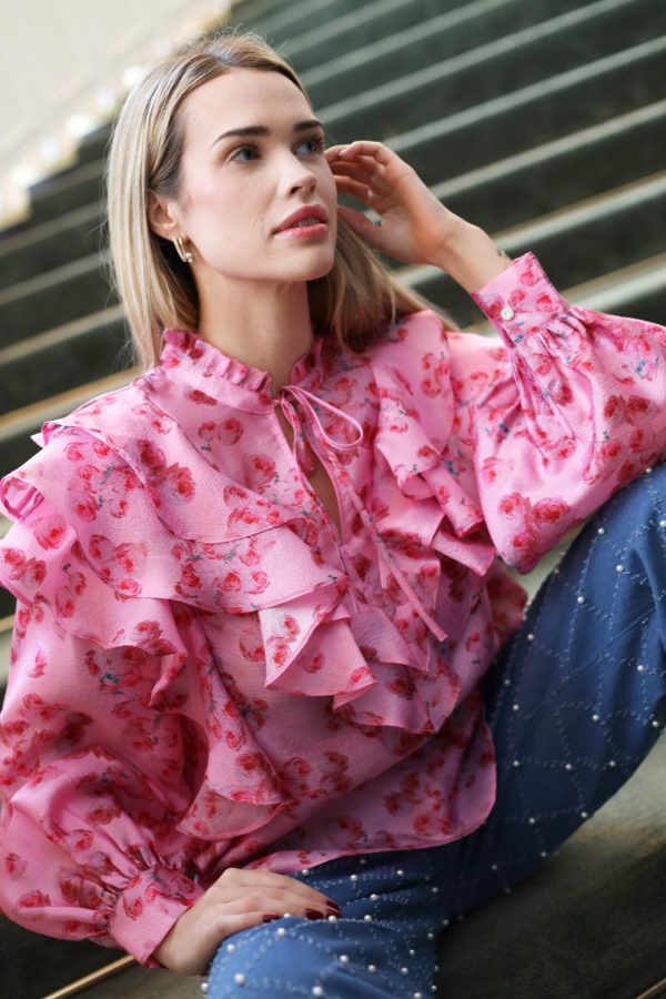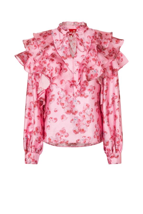 This blouse is made from a lightweight, shiny material and features beautiful ruffles along the front and shoulders. The high neckline ties with a delicate string, while the long sleeves are voluminous and gathered at the cuffs.The style runs true to size, so we recommend choosing your usual size.• Long puffed sleeves• Voluminous ruffles• Loose fitMaterial: 100% recycled polyester.