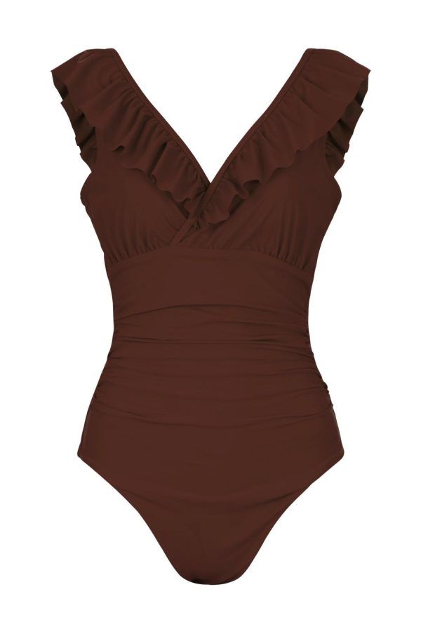 Flattering swimsuit with a deep back, wrap effect, and ruffle details, available in a cool print or solid color.The style fits true to size, so we recommend choosing the size you normally wear.• Wrap effect• V-neckline• Ruffle details• Deep backThe models are wearing sizes 36-40.Materials: 82% recycled polyamide, 18% elastane.