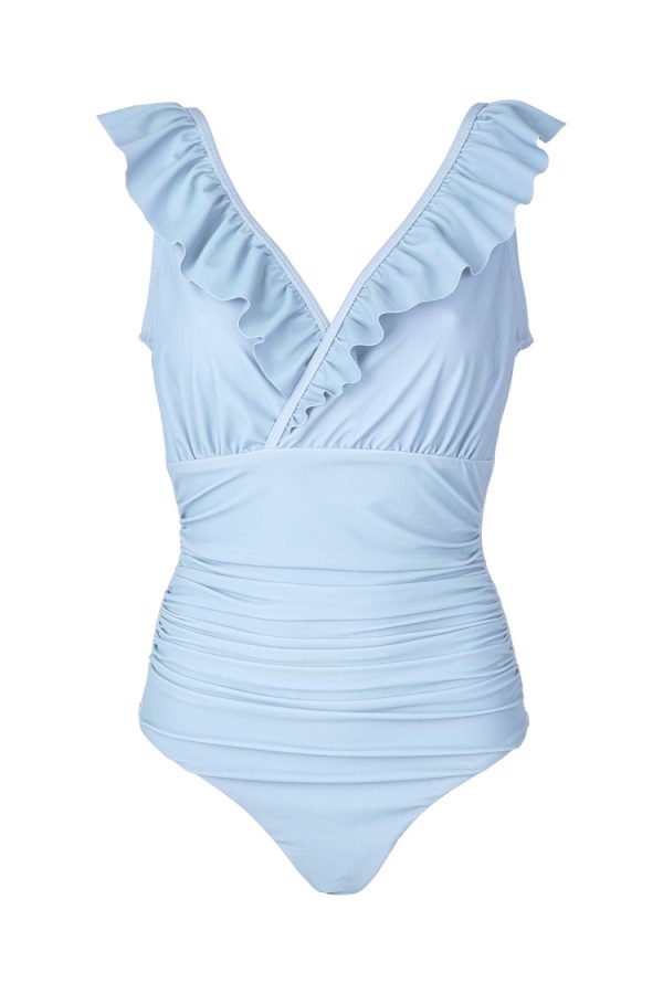 Flattering swimsuit with a deep back, wrap effect, and ruffle details, available in a cool print or solid color.The style fits true to size, so we recommend choosing the size you normally wear.• Wrap effect• V-neckline• Ruffle details• Deep backThe models are wearing sizes 36-40.Materials: 82% recycled polyamide, 18% elastane.