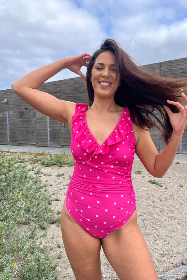 Flattering swimsuit with a deep back, wrap effect, and ruffle details, available in a cool print or solid color.The style fits true to size, so we recommend choosing the size you normally wear.• Wrap effect• V-neckline• Ruffle details• Deep backThe models are wearing sizes 36-40.Materials: 82% recycled polyamide, 18% elastane.