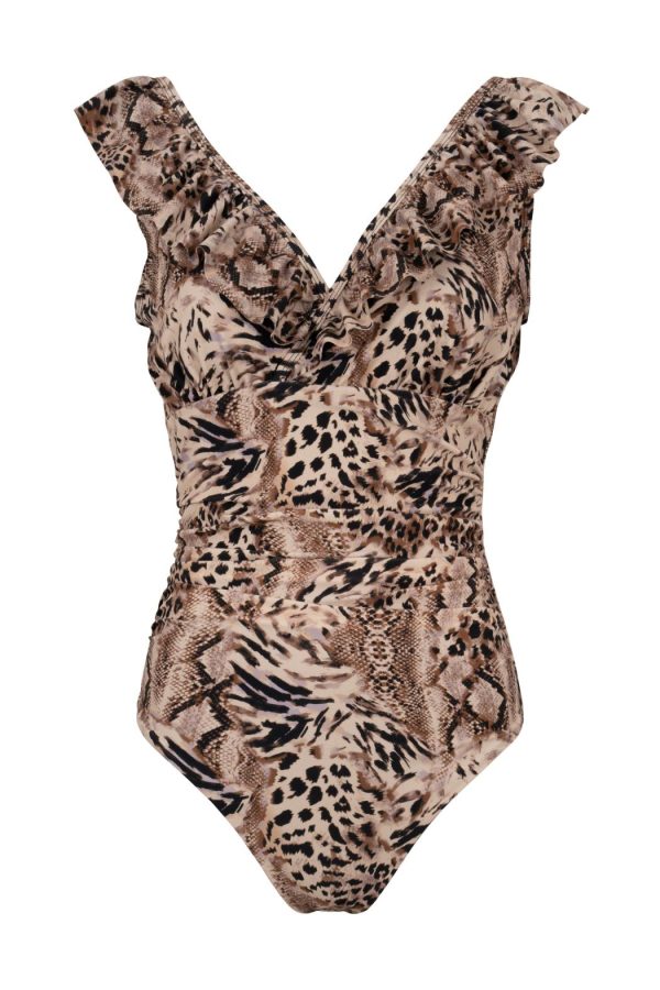 Flattering swimsuit with a deep back, wrap effect, and ruffle details, available in a cool print or solid color.The style fits true to size, so we recommend choosing the size you normally wear.• Wrap effect• V-neckline• Ruffle details• Deep backThe models are wearing sizes 36-40.Materials: 82% recycled polyamide, 18% elastane.